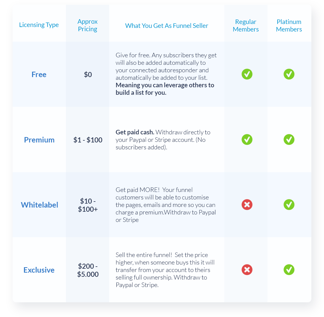 As a platinum member you’ll be able to sell Whitelabel and Exclusive funnels, setting a much higher price – PLUS you’ll be able to use our cloning feature to create these higher priced funnels in 1 click… which will be a piece of cake for you!